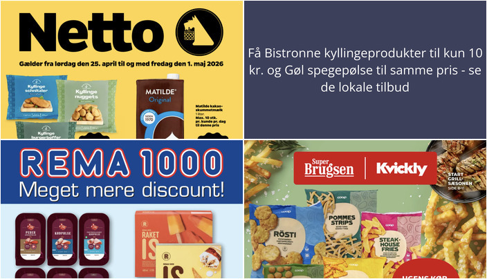 Netto tilbyder Bistronne kyllinge schnitzler, nuggets og burgerbøffer til kun 10 kr. pr. pakke. Vægten varierer mellem 270-400 g, hvilket giver en maksimal pris på 37,04 kr. pr. kg. Tilbuddet gælder fra lørdag den 25. april til fredag den 1. maj.